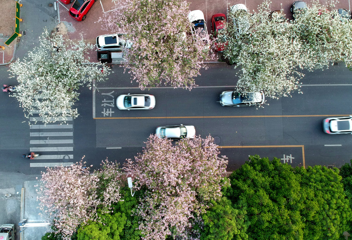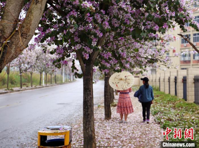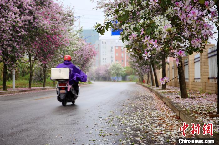 4月15日,一场春雨让广西柳州市区内盛开的30万株洋紫荆落英缤纷,树上不断飘落着粉色的花瓣,市民和车辆穿梭其中,整个城市宛如最美人间四月天,充满浪漫气息。(图片来源:中新网)