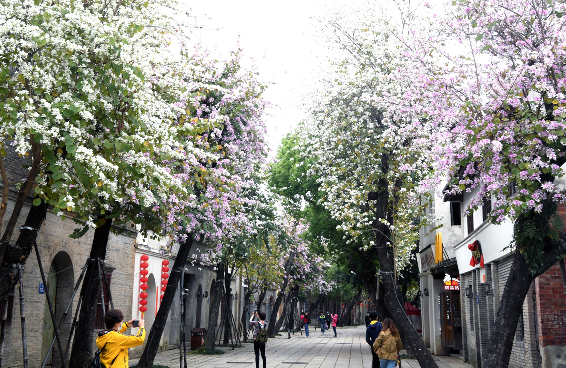 4月17日,福州上下杭历史文化街区羊蹄甲盛开,吸引不少民众前来打卡赏花。(图片来源:中新社)