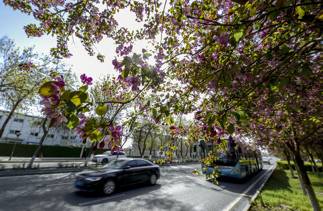 4月18日,新疆乌鲁木齐市,车辆从盛开的海棠花下驶过。(图片来源:中新社)