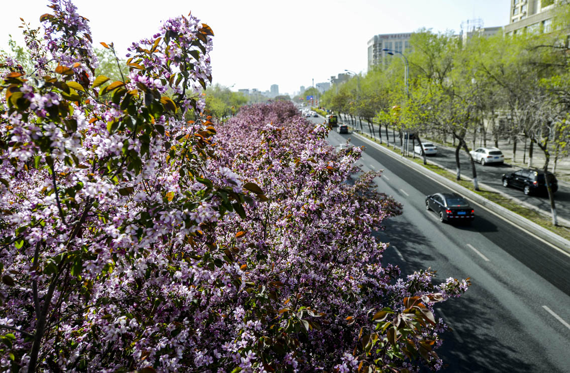 近期,乌鲁木齐市北京北路道路中间隔离带的连片海棠花进入盛花期,形成“海棠大道”,成为城市一道靓丽的风景线。(图片来源:中新社)