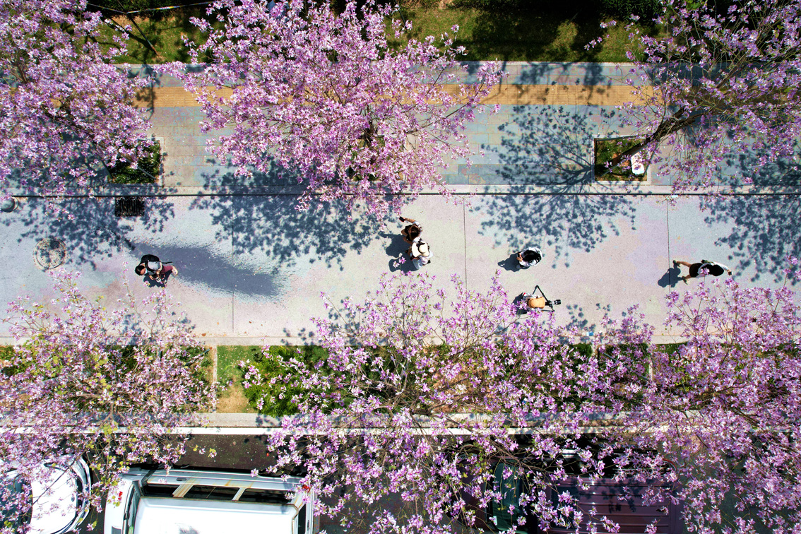 4月12日,福建福州,市民观赏宫粉紫荆花。连日来,福州晋安湖旁茶香路沿线的宫粉紫荆花进入盛花期,吸引市民游客前来赏花拍照(无人机照片)。(图片来源:中新社)