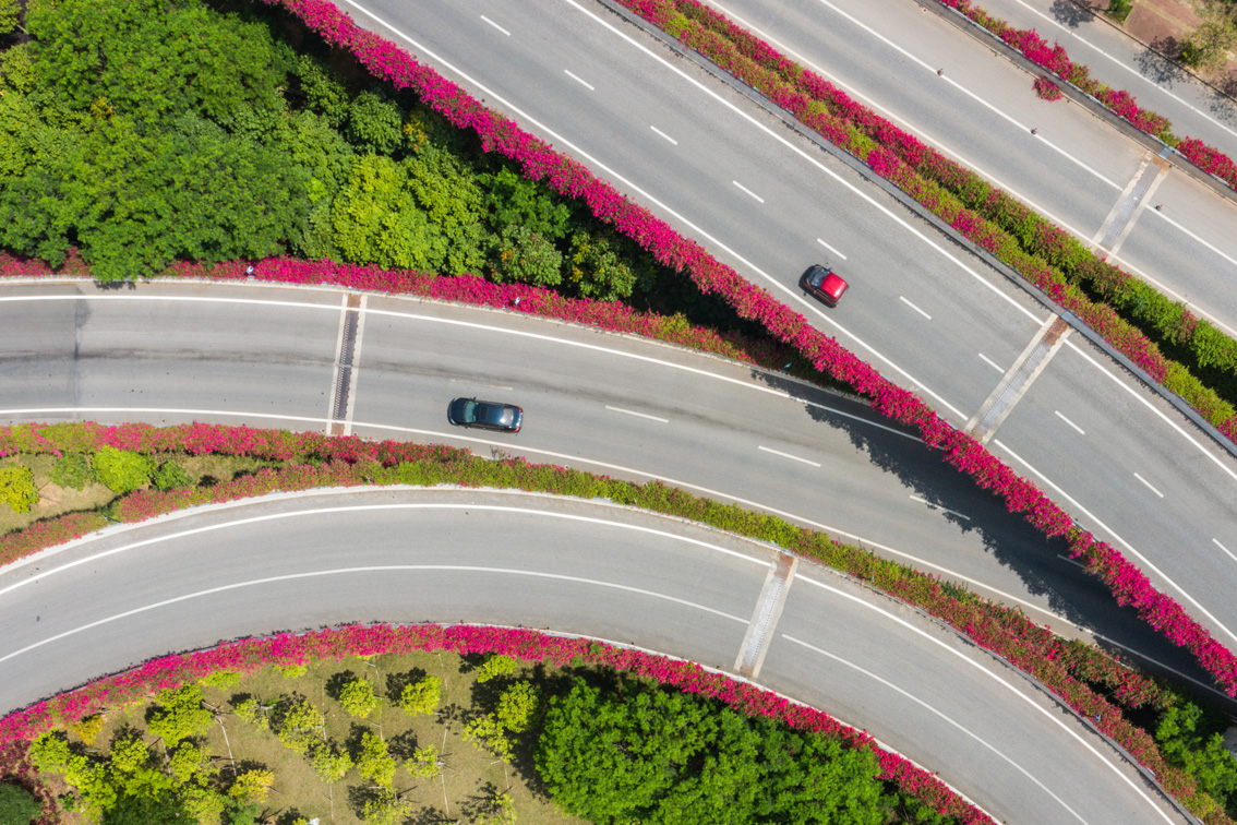4月14日,广西南宁市平乐玉洞立交桥桥面两侧水红色的三角梅盛开,车行其中如同穿过镶着“花边”的丝带(无人机照片)。(图片来源:中新社)