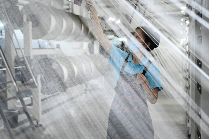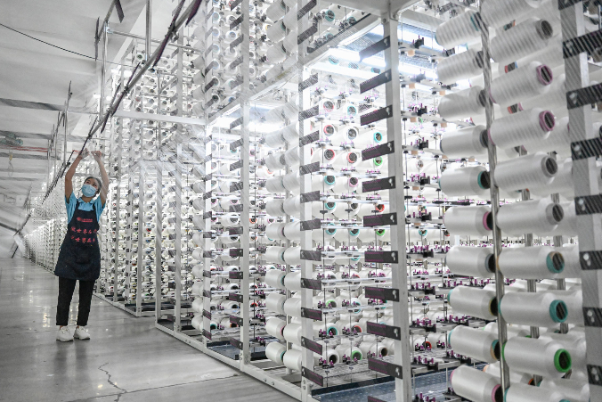 在福建泉州石狮市的一家纺织企业,工人在工厂里忙碌。