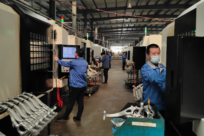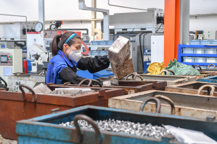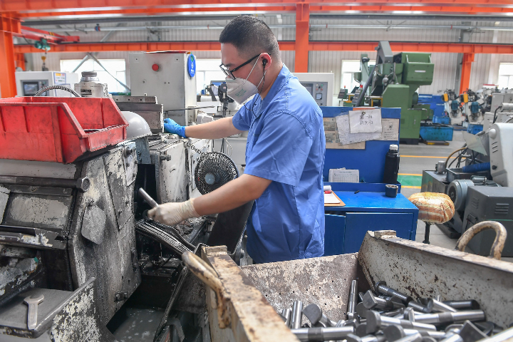 吉林省吉林市为企业制定疫情防控工作方案,落实核酸检测、人员排查、隔离场所、环境消杀、心理疏导等日常防疫措施,保障因疫情停产企业有序复工复产。图为19日,在位于吉林市的富奥汽车零部件股份有限公司紧固件分公司车间,工人在生产车用零件。