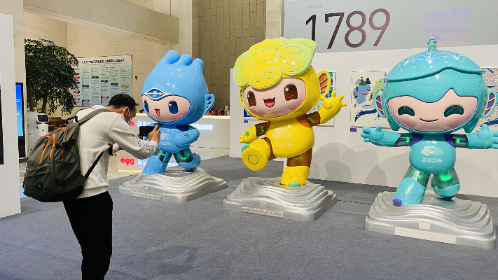 4月20日,参观者拍摄亚运会吉祥物。(图片来源:中新社)