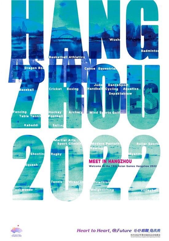 李洁还将图画与文字“Hangzhou2022”及比赛项目相组合,给人一种在水上泛起涟漪的感觉,表达出大家相聚一堂,象征着各个参赛国因亚运会汇聚在杭州的欢乐和友好。