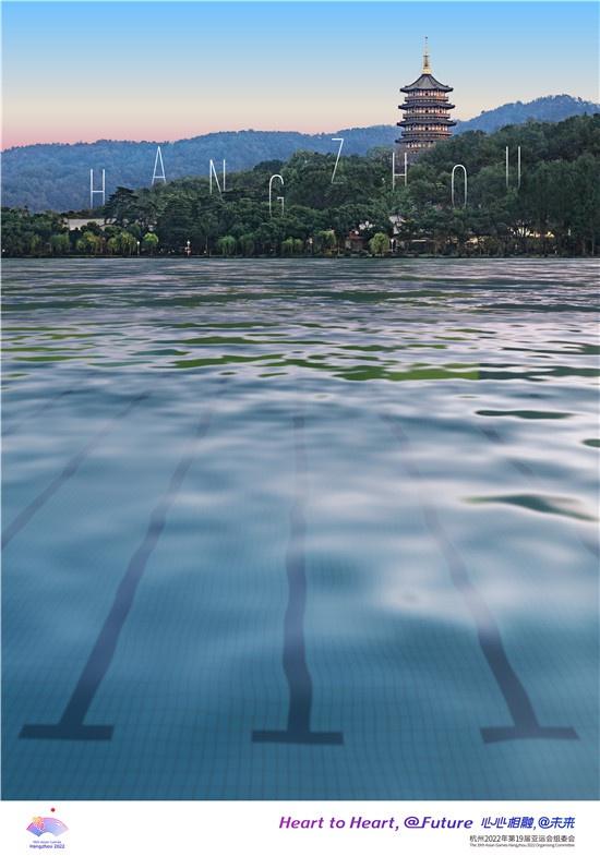罗博怀在设计中将“西湖”与游泳赛道结合。画面中荡漾的湖面浮现泳池的形态,画面下方极具视觉指向性的泳池赛道连接湖畔、远山与雷峰塔。“HANGZHOU”字样在远山中若隐若现,向世界发出来自杭州的邀请。表达出对各国运动员来杭州的欢迎之情,可以在山水城市中体验竞技与悠闲。