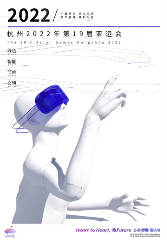海报以“智能观赛”为灵感来源,蓝色和白色分别体现杭州亚运会的科技感与未来感。海报展示了AR和VR技术的应用,突破观赛位置局限,用视觉语言向世界展现“智能亚运,数字杭州”。