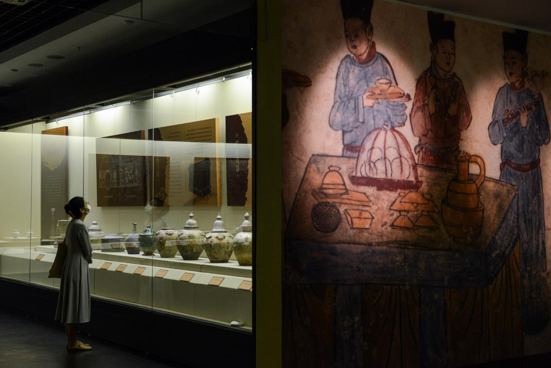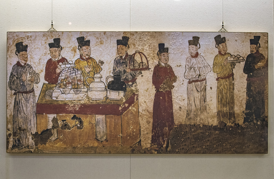 4月17日在重庆中国三峡博物馆“西京印迹——大同辽金元文物展”上拍摄的金代“侍宴图”。展览由重庆中国三峡博物馆和大同市博物馆共同主办,以民族融合为主题,展出辽金元时期铜器、金银器、陶瓷、家具、壁画等140余件(套)珍贵文物,向观众展现了辽金元时期器物制作的工艺水准,和那一时期民族交融下独特的民风民俗。(图片来源:新华社)
