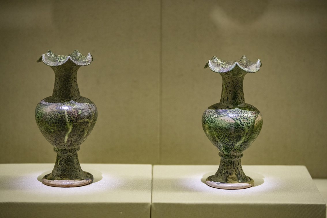 这是4月17日在重庆中国三峡博物馆“西京印迹——大同辽金元文物展”上拍摄的金代“绿釉花口瓶”。(图片来源:新华社)