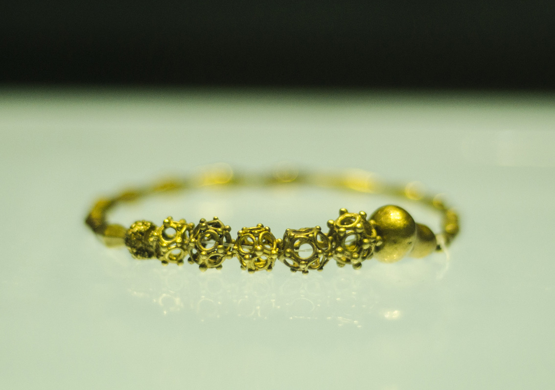 广西北海市合浦汉代文化博物馆陈列的来自东南亚地区的湖蓝色玻璃杯、印度的金花球手链串饰,以及出自汉代海上丝绸之路沿线国家的海蓝宝石、水晶、玛瑙等珍贵文物,印证合浦是汉代海上丝绸之路的始发港之一,也是汉王朝对外开放的重要窗口。图为来自印度的金花球手链串饰。(图片来源:中新社)