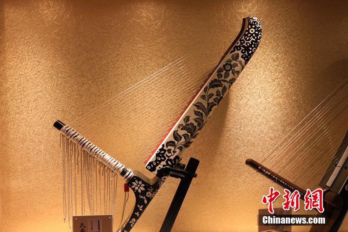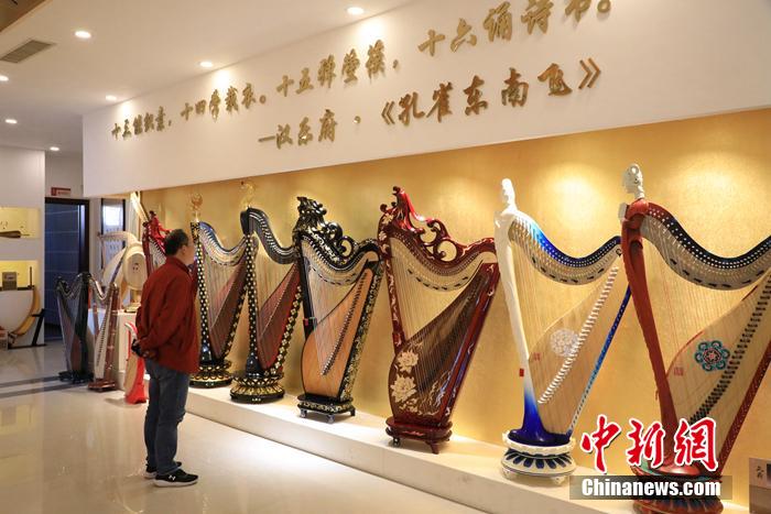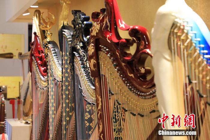 图为4月19日,中国箜篌博物馆里展示的箜篌。(图片来源:中新网)