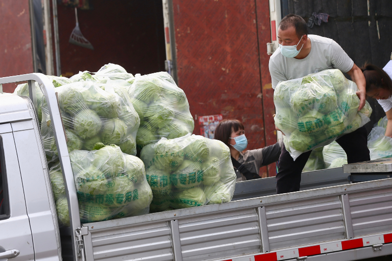 25日,北京新发地农产品批发市场,商户在装运蔬菜。据悉,北京新发地农产品供应充足。(图片来源:本文图片均综编自中新社)