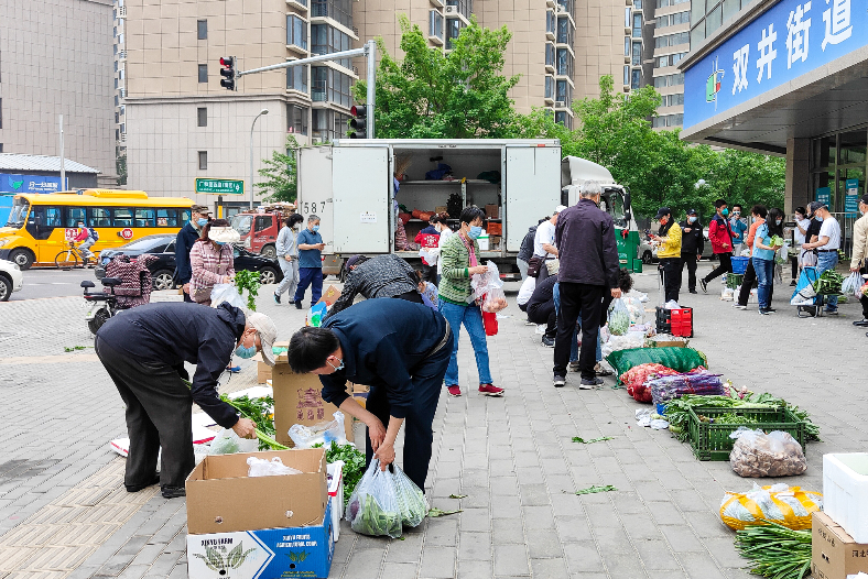 25日,北京市朝阳区双井街道一处空地上,新发地市场的蔬菜直供到小区,居民在楼下采购蔬菜。