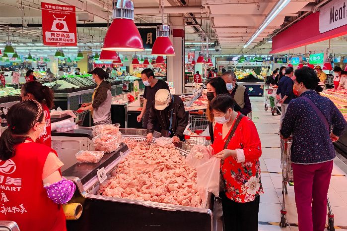 25日,在北京市朝阳区一家超市内,市民在选购鸡肉,该超市内肉类产品供应充足。