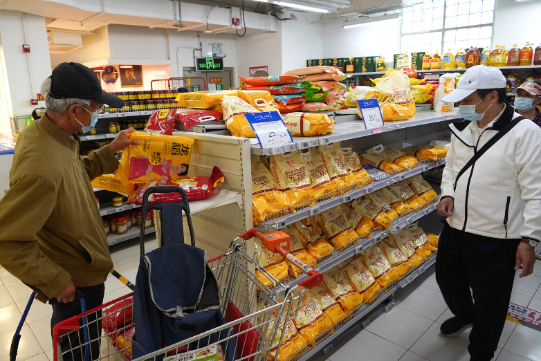 25日,民众在北京市海淀区万寿路一超市内挑选大米。该超市生活物资供应充足。