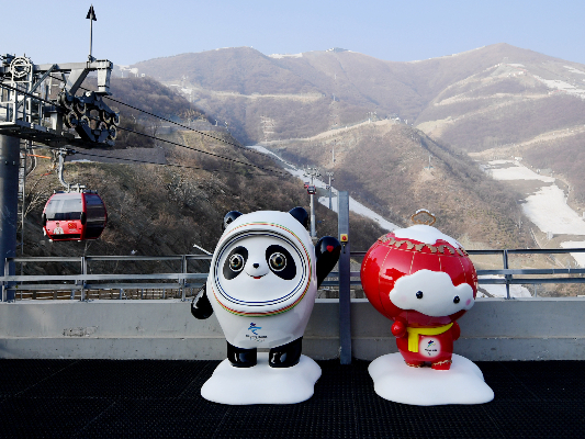 4月25日在中国国家高山滑雪中心拍摄的北京冬奥会、冬残奥会吉祥物“冰墩墩”和“雪容融”。(图片来源:新华社)