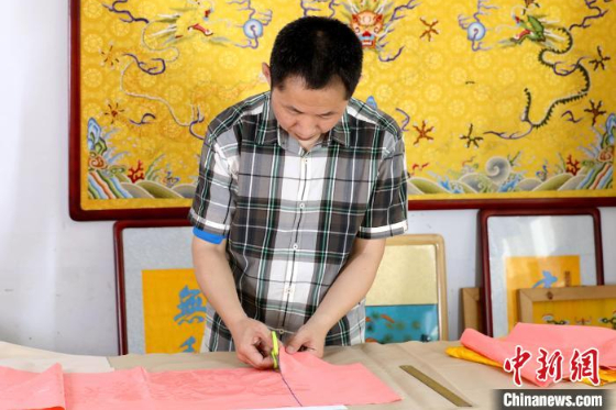 郭庆生正在裁剪刺绣所需的底布。