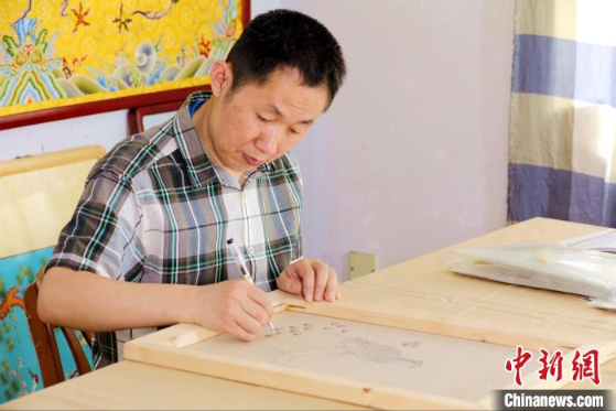 郭庆生在完成刺绣的落图工序。