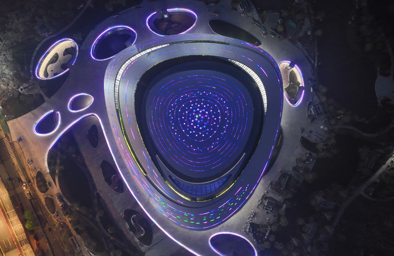 杭州亚运会击剑场馆圆形屋顶如飞碟造型。