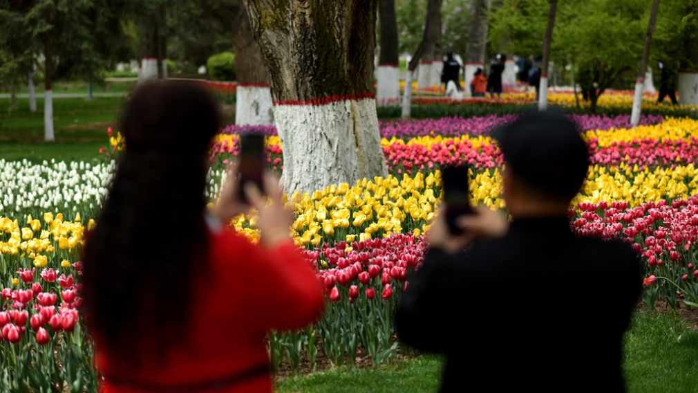 5月1日,两位市民在青海省西宁市人民公园内拍摄鲜花。(图片来源:新华社)