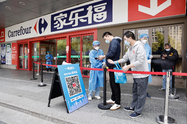 5月2日,在家乐福普陀万里店外,市民需要扫描场所码,出示扫码情况,工作人员验证后方能进入。上海市商务委副主任刘敏表示,目前,超市卖场、药店等线下门店正在逐步恢复经营,将加快推动便利店、生鲜蔬果、餐饮、日用商品、药店等满足市民基本生活的必备业态“应开尽开”。(图片来源:中新社)