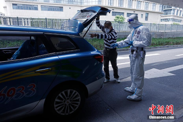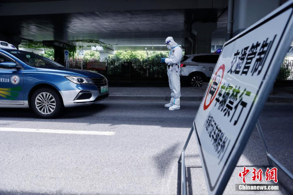 中新网报道,5月1日,上海市公安局长宁公安交警支队民警在天山西路北虹路路口,对车辆和人员进行通行证、核酸检验报告以及绿码等的相关核验工作。
