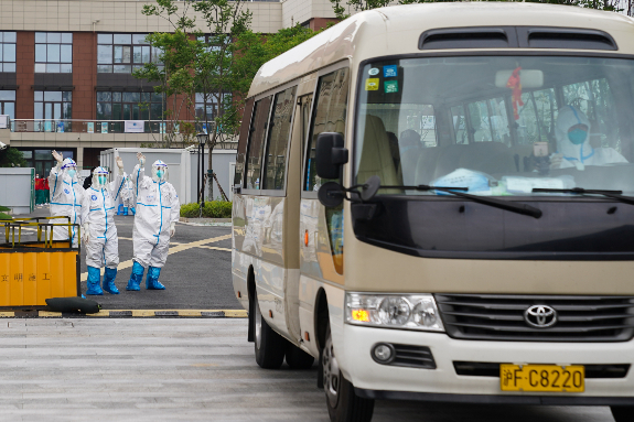 4月30日,在上海市嘉荷新苑方舱,医护人员与出舱患者挥手告别。(图片来源:新华社)
