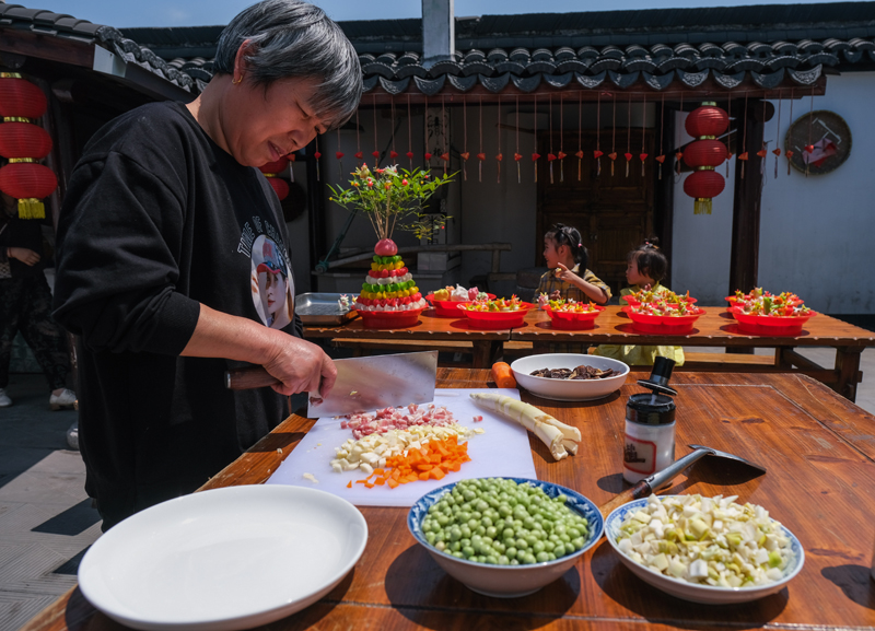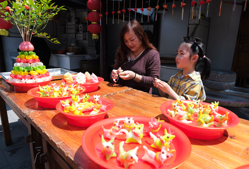 临近立夏节气,浙江省杭州市余杭区塘栖镇丁山河村的村民们举行“传统民俗迎立夏”活动。村民们搭土灶、生火,烧野米饭(又称乌米饭),腌灰鸭蛋(咸鸭蛋),做米塑“立夏狗”等,用水乡传统民俗迎接立夏节气。图为5月3日,村民在制作米塑作品“立夏狗”。(图片来源:新华社)