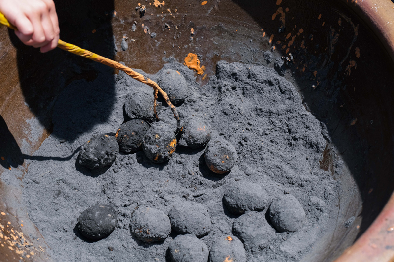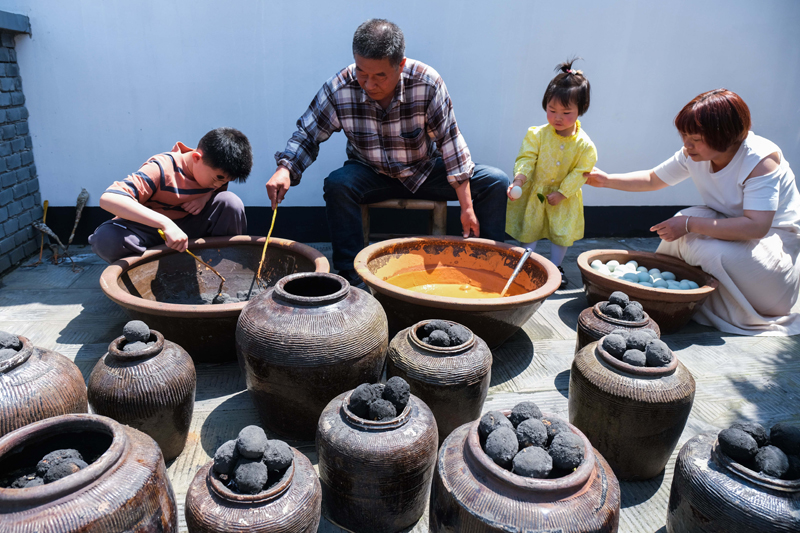 5月3日,孩子们在村民的带领下用黄泥、草木灰等制作传统灰鸭蛋(咸鸭蛋)。(图片来源:新华社)