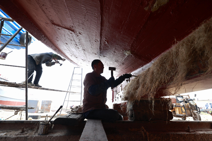 4月29日,在河北省唐山市丰南区黑沿子镇,渔民对休渔的渔船进行维修保养。(图片来源:新华社)