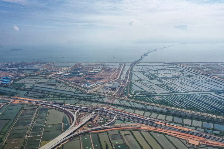 由中铁十一局施工建设的珠海鹤(洲)(高栏)港高速公路二期工程高栏港枢纽立交桥临近竣工,即将对接珠江崖门入海口黄茅海大桥陆上引桥。鹤港高速全长35公里,东起港珠澳大桥连接线,西至珠海高栏港,项目建成后将成为珠江口西岸地区快速对接粤港澳大湾区核心区域的主通道。图为5月5日拍摄的珠海鹤港高速公路二期工程高栏港枢纽立交桥建设现场。(图片来源:新华社)