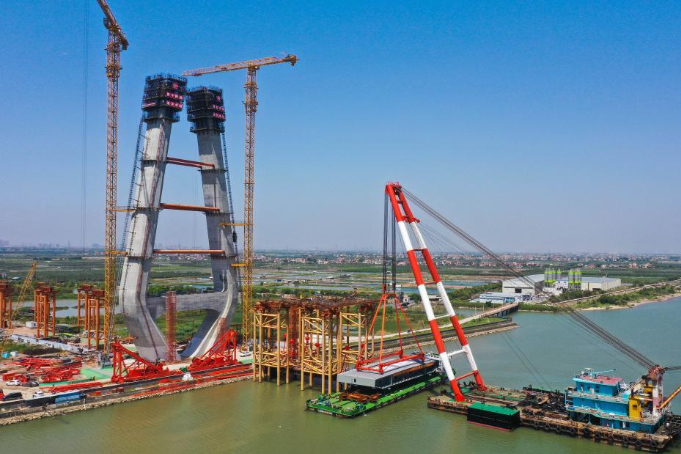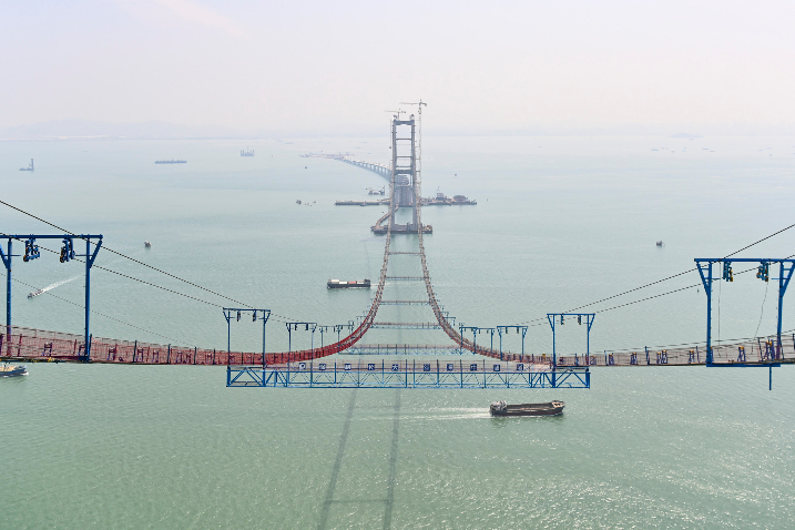 南中高速公路是粤港澳大湾区核心区域互联互通的特大型桥梁工程和跨珠江通道体系的重要组成部分,与深中通道无缝对接,串联起大湾区核心区域东西南北大通道,项目总投资额超200亿元,计划2024年与深中通道同步建成。图为南中高速洪奇门特大桥主桥吊装架设首片钢箱梁施工现场。(图片来源:新华网)