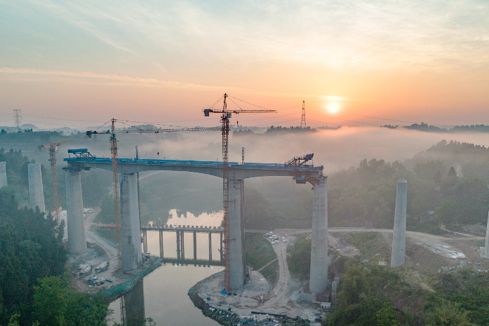 成都至自贡高铁全线重点工程、第一高桥——球溪河双线大桥40米+64米+40米连续梁混凝土5月5日浇筑完成,实现合龙,为标段剩余架梁提供了通过条件。图为薄雾笼罩建设中的球溪河大桥。(图片来源:中新社)