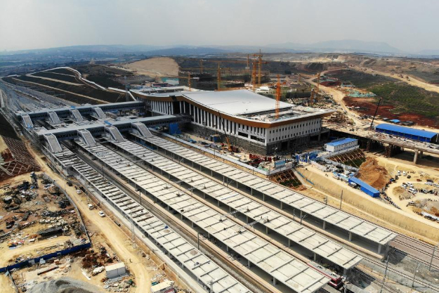 弥蒙高铁北起云桂铁路弥勒站,止于红河哈尼族彝族自治州州府蒙自市,与中越国际通道昆明至河口铁路相衔接。弥蒙高铁正线长约107公里,开行旅客列车速度目标值为每小时250公里,2018年开工建设,桥隧比达45%以上。目前,弥蒙高铁土建和轨道工程已全部完成,预计年内可建成通车。图为在云南省红河哈尼族彝族自治州蒙自市拍摄的弥蒙高铁红河站施工现场。(图片来源:新华网)