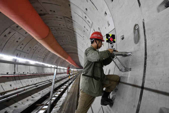 近日,在天津地铁11号线学苑北路站至海河东路站盾构区间施工现场,建设者在做好疫情防控工作的同时积极推进项目建设,确保工程建设进度。图为工作人员进行测量作业。(图片来源:新华网)