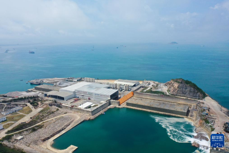 深中通道海底隧道全长6845米,其中预制沉管段长5035米,由32节沉管和1个最终接头组成。目前,深中通道沉管安装长度已达3712.8米,接近沉管段总长度的四分之三。图为深中通道3节沉管齐聚中交四航局牛头岛沉管智慧工厂。(图片来源:新华网)