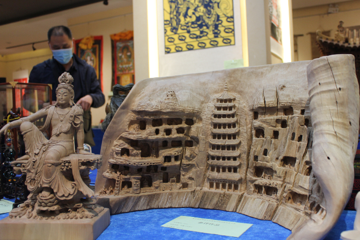 5月10日,以敦煌莫高窟为题材的木雕作品《守护》亮相兰州。(图片来源:中新社)