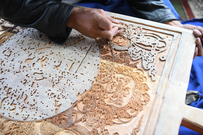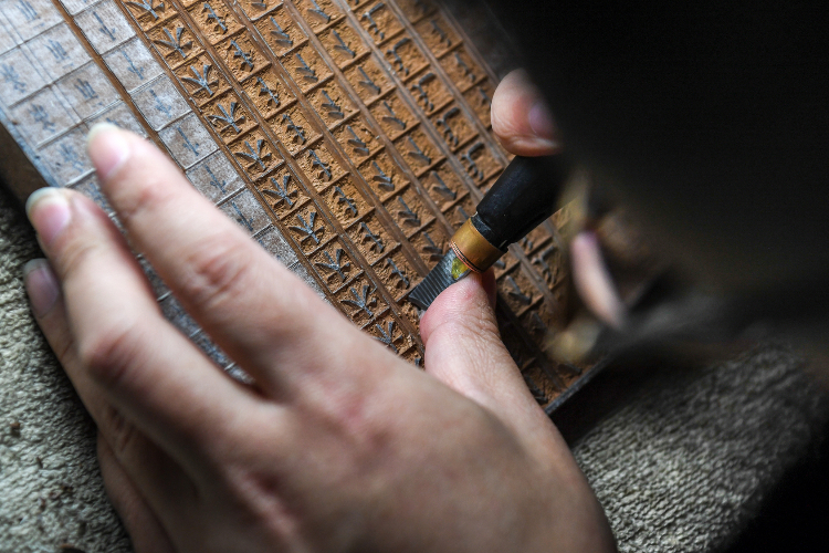 西藏拉萨市尼木县普松乡被誉为“雕刻之乡”,全乡有一半的家庭从事雕刻和经幡印制。2009年,普松雕刻制作技艺被列为西藏自治区级非物质文化遗产。尼木县珍宝雕刻手工艺农牧民专业合作社的雕刻艺人将自身传统民间雕刻艺术与现代雕刻艺术结合,不仅有文字雕刻,还有图文并茂的图案雕刻,用于印制经文、经幡及旅游文创产品。自2016年合作社成立至今,带动当地民众就近就业共36余人。图为5月8日,尼木县珍宝雕刻手工艺农牧民专业合作社的手工艺人在雕刻文创产品。(图片来源:中新社)