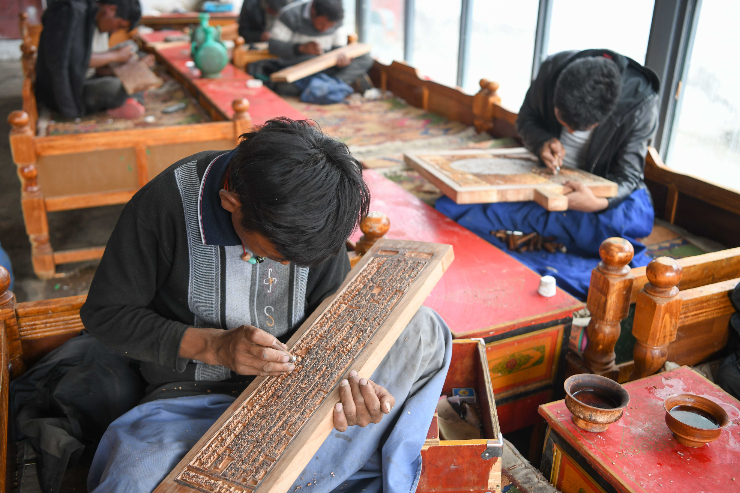 尼木县珍宝雕刻手工艺农牧民专业合作社的手工艺人在雕刻经板。(图片来源:中新社)