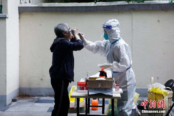 在昭化东路200弄门前临时核酸检测采样点,市民进行核酸检测采样。(图片来源:中新网)