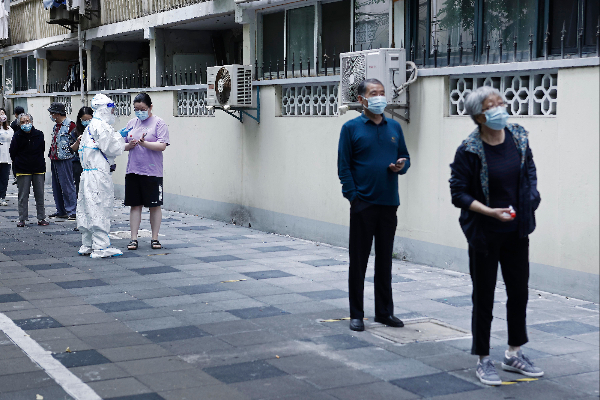 5月11日,在上海市长宁区昭化东路200弄门前临时核酸检测采样点,民众有序等待进行核酸检测采样。(图片来源:中新社)