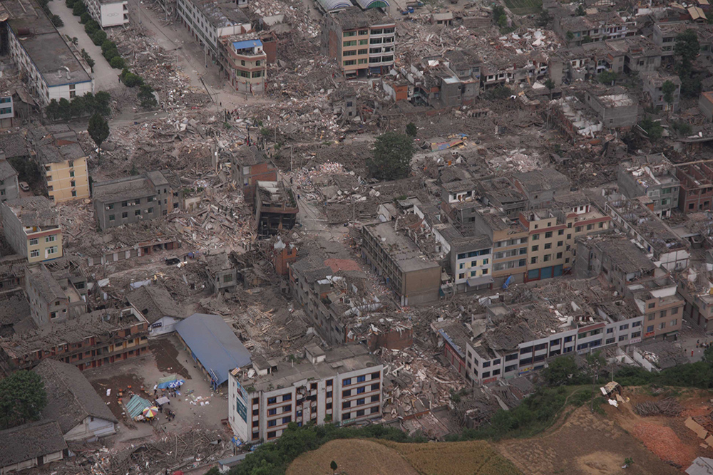 5月12日汶川大地震将平武县南坝镇成为一片废墟,是全县受灾最严重的地方。(图片来源:中新社)