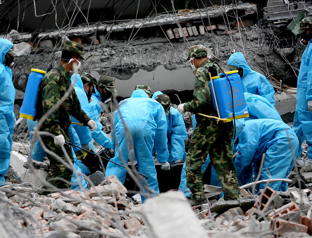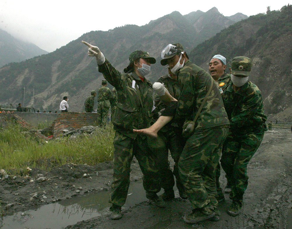 解放军士兵在重灾区映秀镇漩口中学倒塌教学楼里,按照国家规定人道安置遇难学生。(图片来源:中新社)