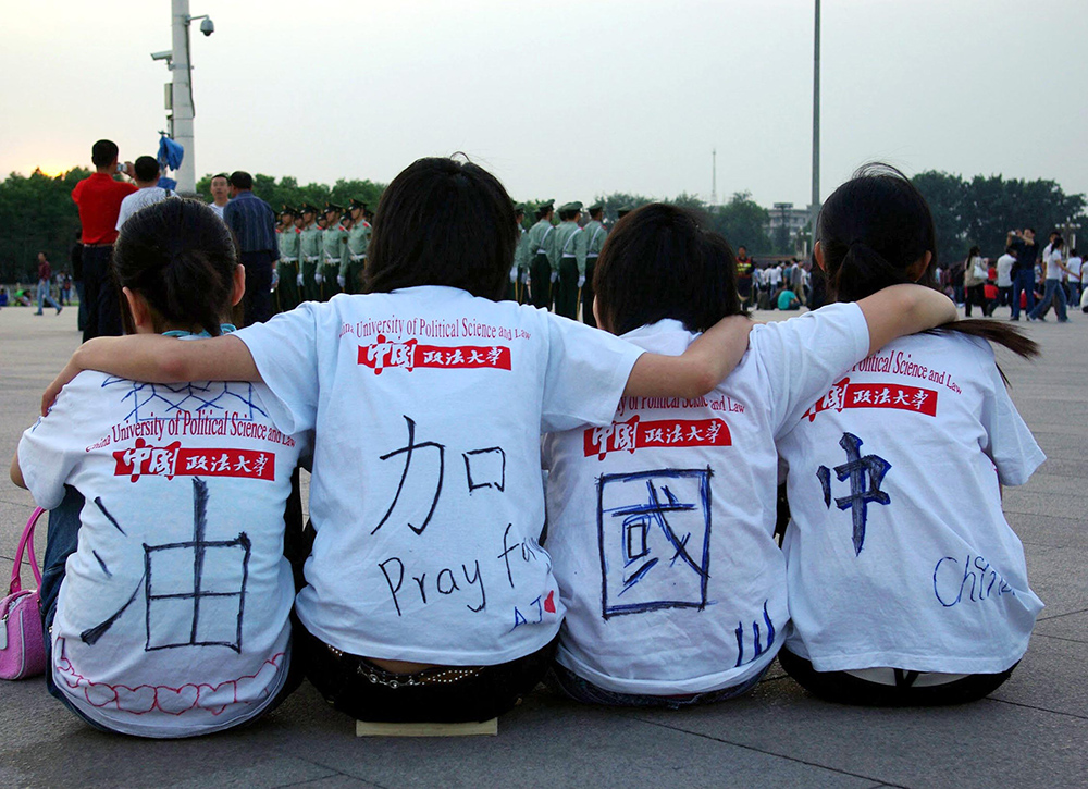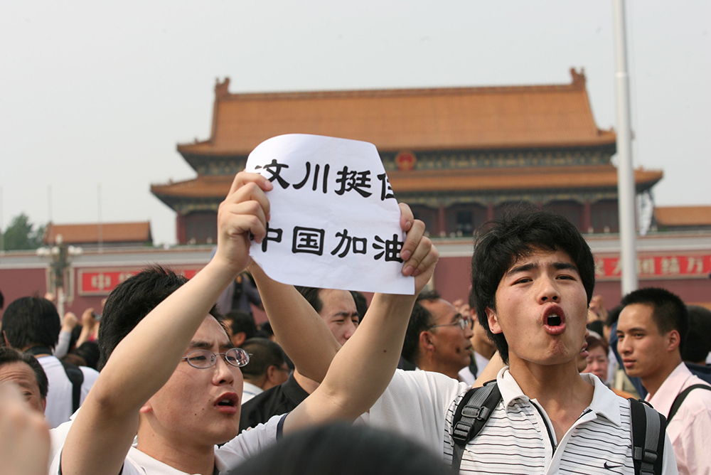 数万民众在北京天安门广场向四川汶川大地震遇难者致哀后,高举“汶川挺住中国加油”为灾区民众加油。(图片来源:中新社)