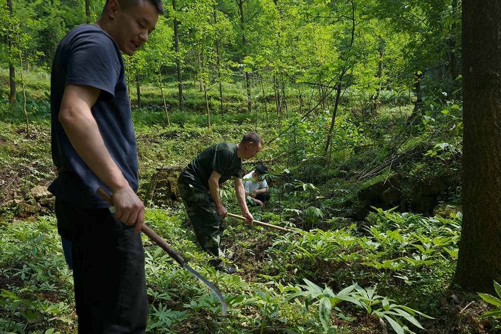 汶川地震后,重组家庭后的村民在地里种植药材除杂草。(图片来源:新华社)