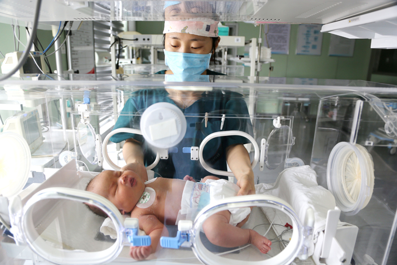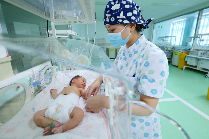 5月11日,在贵州省黔东南苗族侗族自治州岑巩县妇幼保健院,医护人员在新生儿科查看新生儿健康状况。