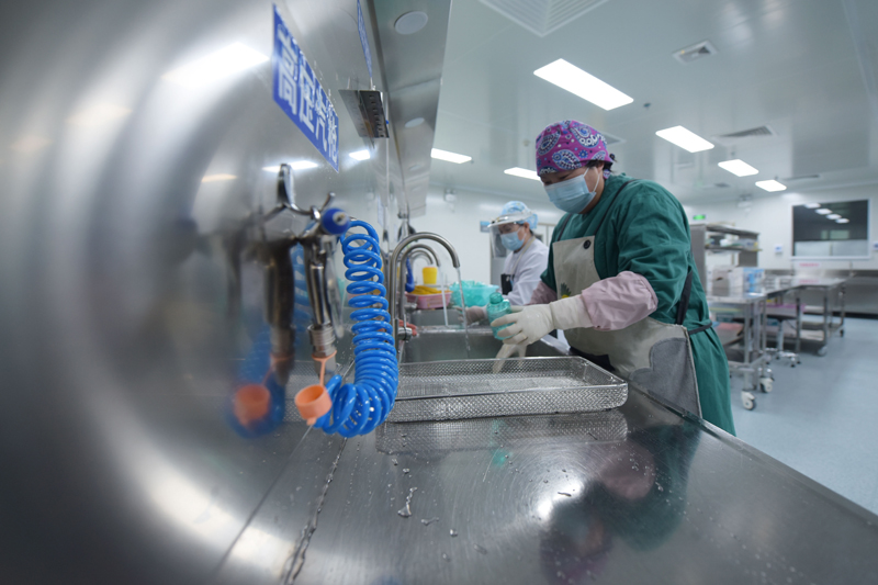 5月11日,护士在贵州省黔东南苗族侗族自治州岑巩县人民医院消毒供应中心清洗医疗器械。