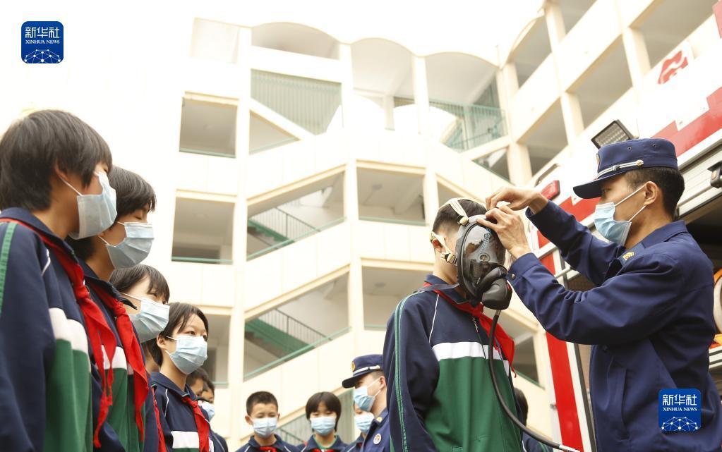 5月11日,在河北省邢台市第二十八中学,消防员在给学生讲解消防知识。(图片来源:本文图片除标注外均自新华社)