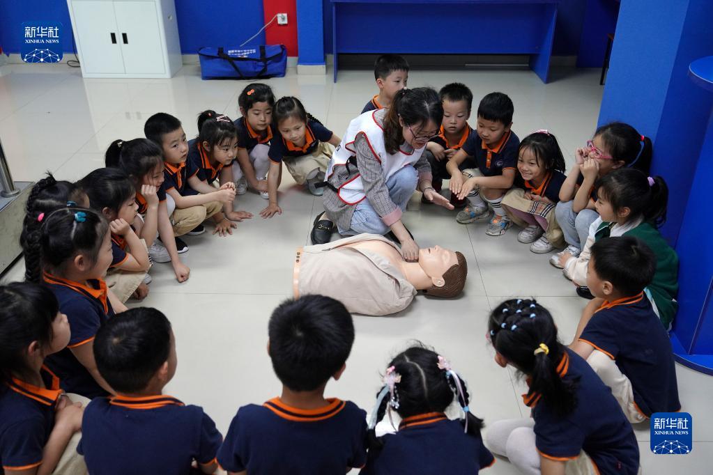5月11日,在重庆市北碚区水土街道和欣家园社区科普基地,医护人员在给孩子们讲解心肺复苏知识。